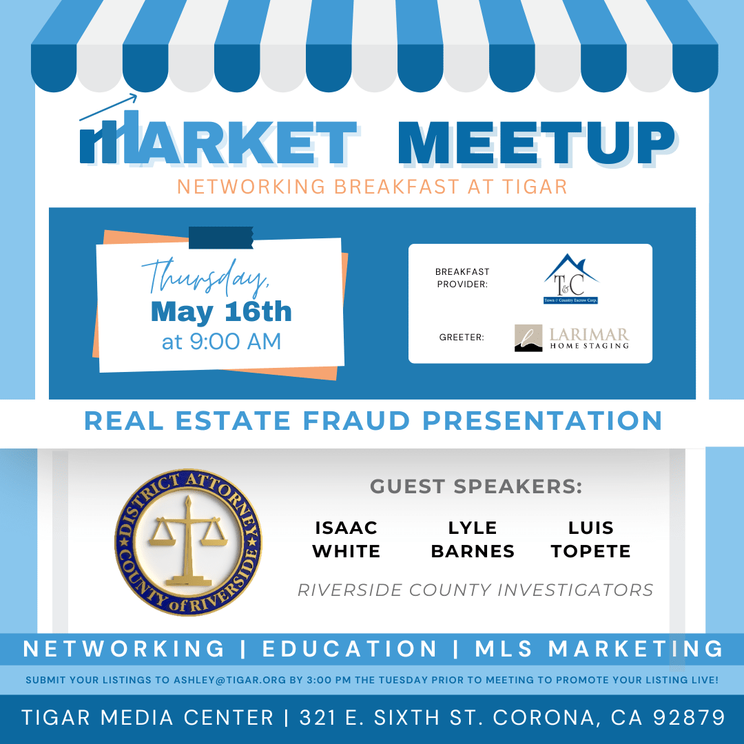 Join us for our Market Meetup on Thursday, May 16th at 9:00 am, in person at the TIGAR Corona Media Center! Geared towards REALTORS® and affiliates eager to bolster their connections and stay informed, this monthly gathering offers a prime opportunity to tap into industry insights.This month, we're thrilled to welcome three Riverside County Investigators from the District Attorney's Office, Isaac White, Lyle Barnes, and Luis Topete. They will shed light on real estate fraud with an engaging presentation. Breakfast will be provided by Town & Country Escrow, with a warm welcome from Larimar Home Staging as our greeter. Don't miss out on this great event! Register today for free at tigar.org/marketmeetup!