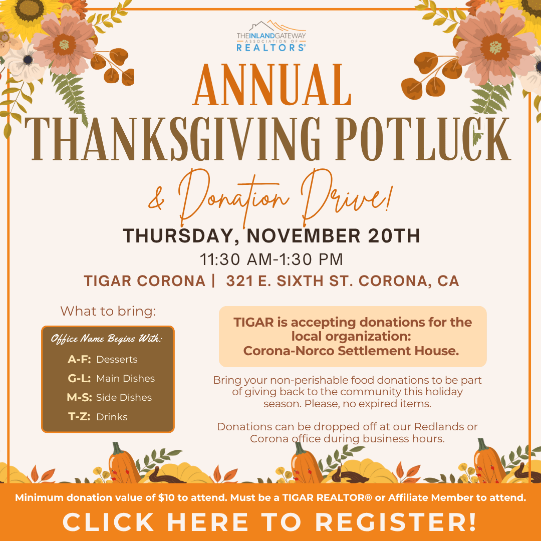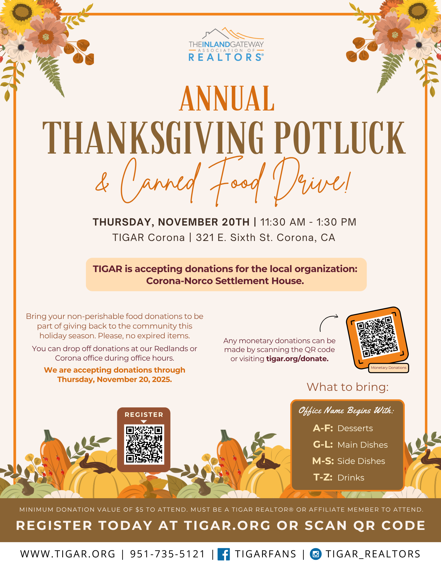 Join us for TIGAR’s Annual Thanksgiving Potluck & Canned Food Drive! Celebrate the season of gratitude with your fellow members while giving back to the community.