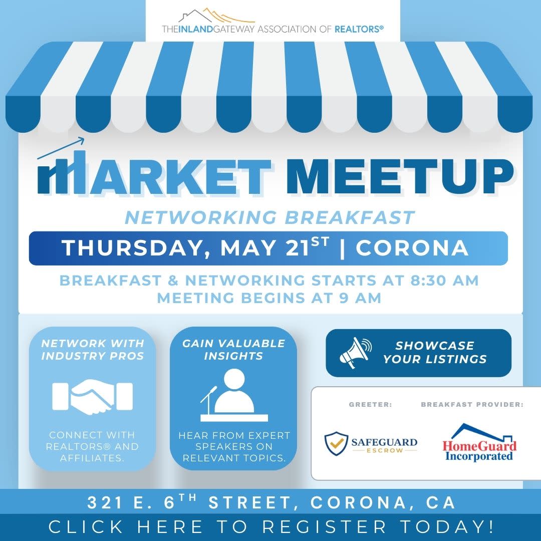 Fuel your morning with knowledge and connections at TIGAR’s Market Meetup Breakfast Meeting! Join us on the 3rd Thursday of every other month at TIGAR Corona (321 E. Sixth Street, Corona, CA 92879) for an engaging and informative session focused on the real estate industry. Doors open at 8:30 AM, giving you time to grab a delicious breakfast provided by one of our affiliates before the meeting begins at 9:00 AM.