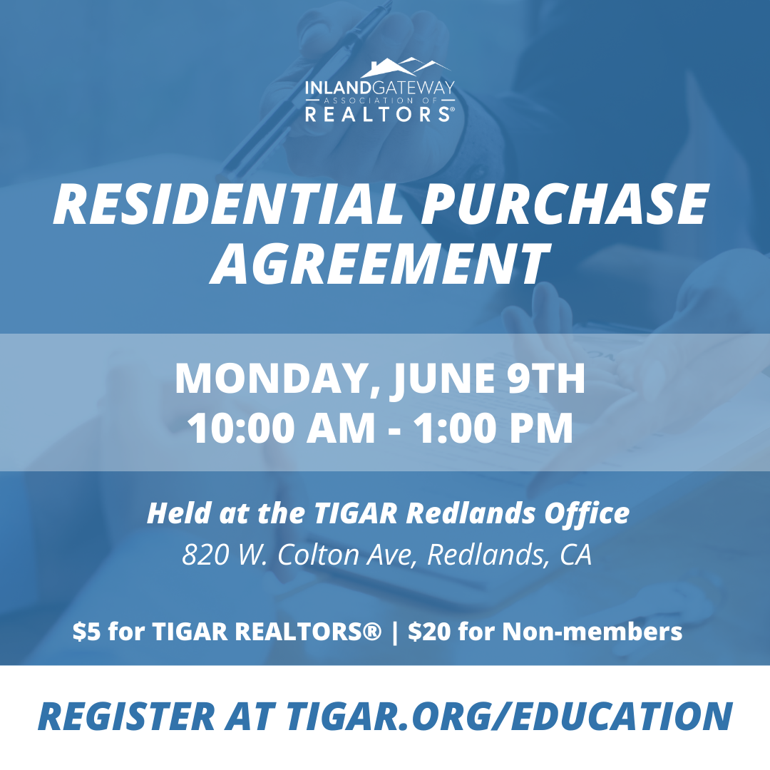 DESCRIPTION:Please join our IN-PERSON class with Joel Carlson and learn everything about the Residential Purchase Agreement! Monday\, June 9th from 10:00 AM  1:00 PM at the TIGAR Redlands Office. $5-TIGAR REALTOR  Members\n$20-Non members